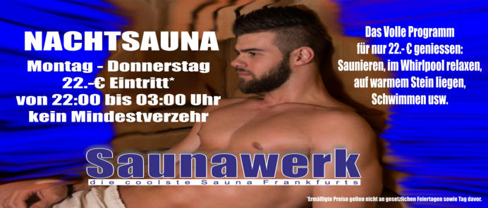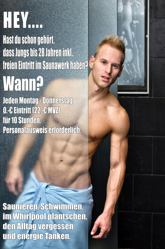 2. und 4. Mittwoch im Monat Jungs bis 28 Jahre Inkl., Schüler und Studenten 14.-€ Eintritt (kein MVZ, 10Std. gültig). Inkl. Salz Peeling 16:30 - 20:30
